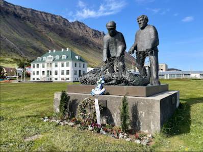 What you see are two male figures hauling in and looking over a net with their catch of the day. They stand on a rectangular base with a few planted flowers in front. The monument is flanked by flagpoles. Worth a brief look-see if exploring Isafjordur.